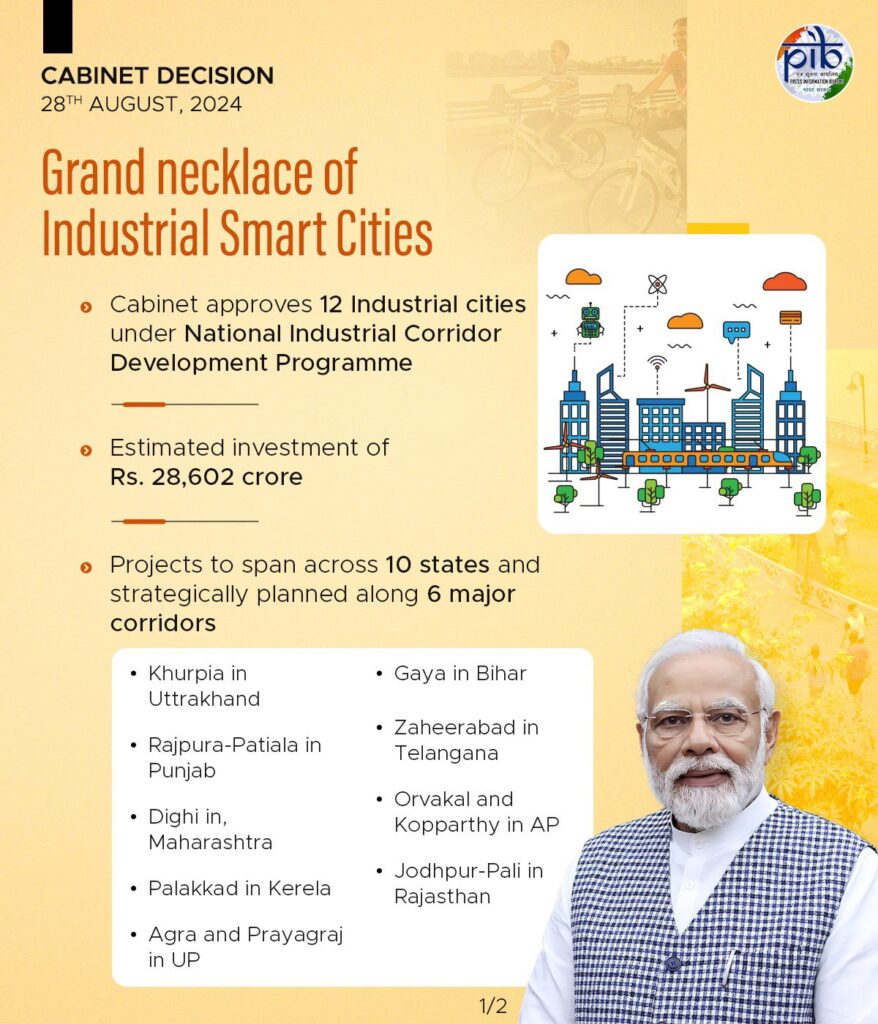 5. With the estimated budget of 28602 crore A grand necklace of Industrial Smart Cities on the backbone of Golden Quadrilateral has been approved ,it will have- 12 Industrial Cities